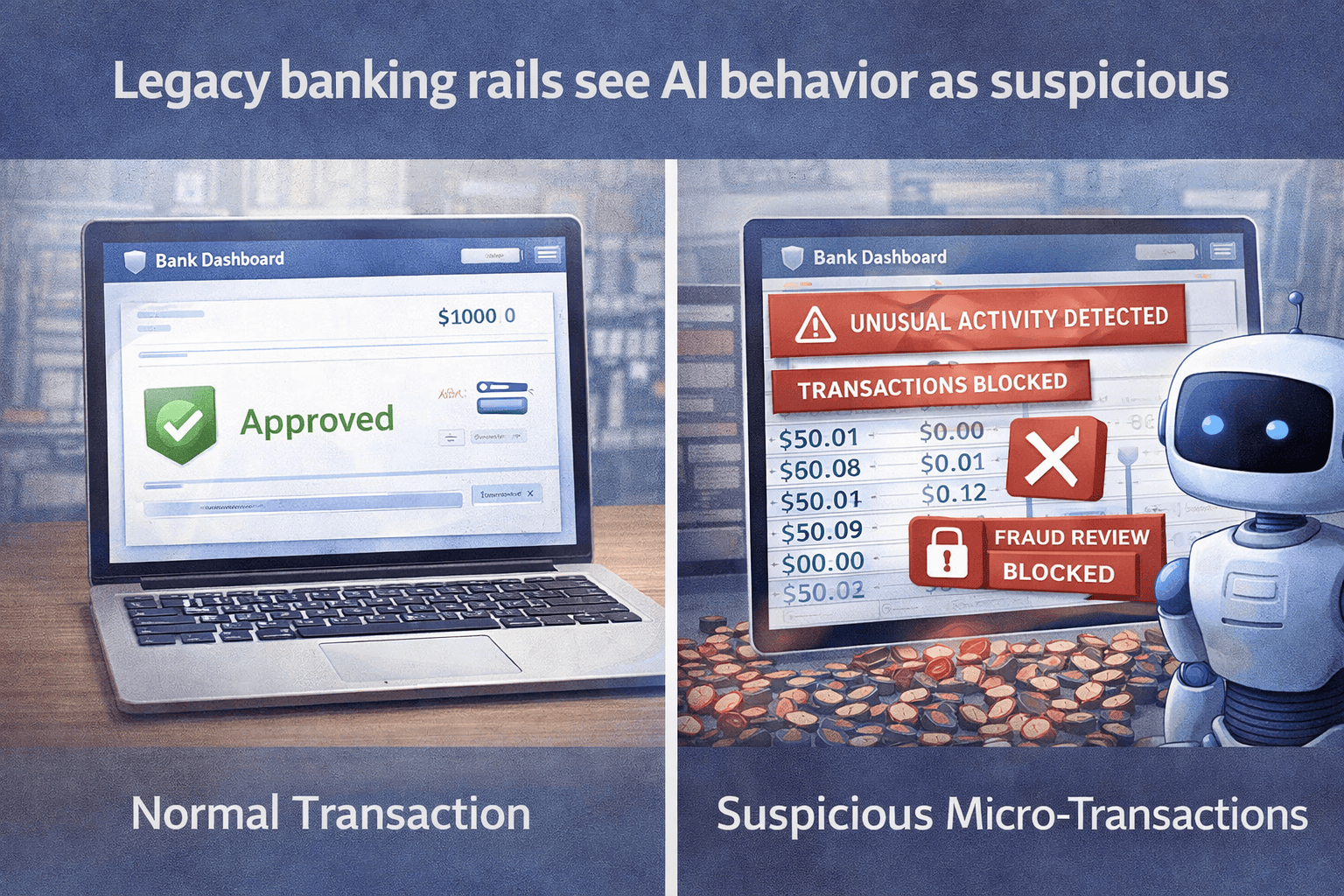 If an AI agent sends thousands of micro-transactions through legacy banking rails, these systems immediately flag it as unusual behavior and block them entirely.
