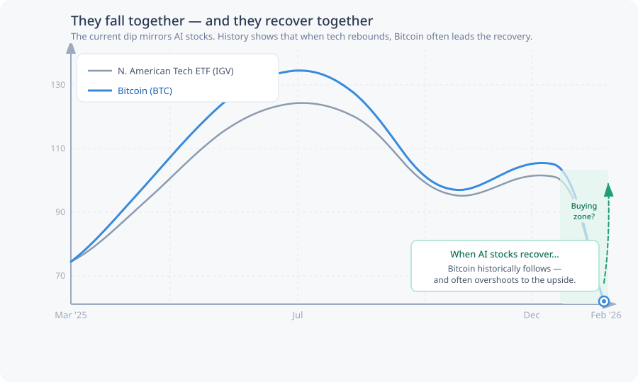 As many smart investors have noticed, Bitcoin and crypto prices are becoming more and more pegged to AI tech stocks like Nvidia and Microsoft.