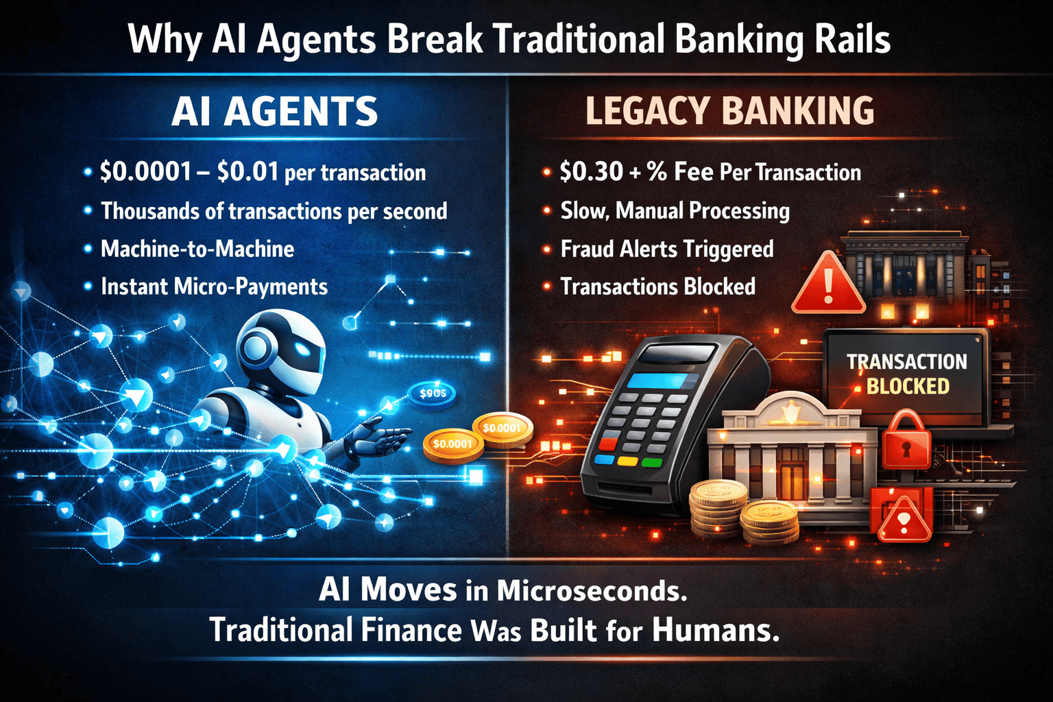 If an AI agent sends thousands of micro-transactions through legacy banking rails, these systems immediately flag it as unusual behavior and block them entirely.